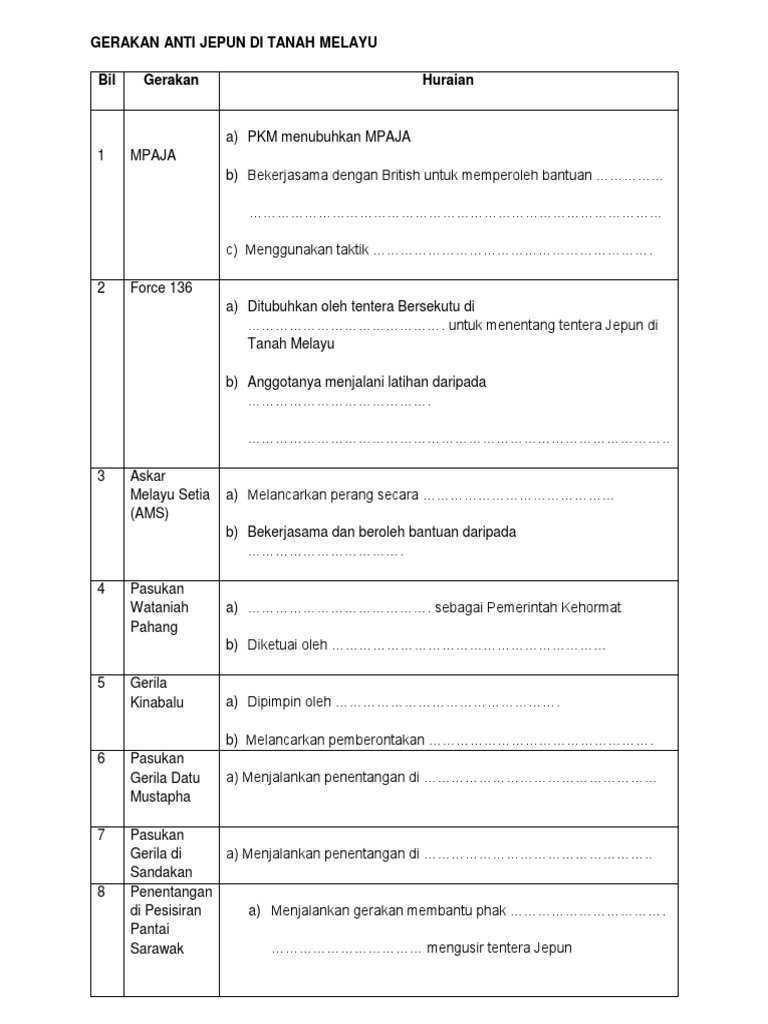 Malayan people's anti japanese army (mpaja) ditubuhkan oleh parti komunis malaya (pkm) bekerjasama dengan british untuk mendapat bantuan kewangan, latihan ketenteraan & senjata menggunakan taktik perang gerila. Kesedaran pembinaan negara dan bangsa. Bab 4 gerakan anti penjajahan nasionalisme lessons tes teach. Dengan itu, bermulalah zaman pendudukan jepun di tanah melayu yang hanya berakhir pada ogm 1945. Walaupun dengan bilangan yang lebih ramai, tentera yang diletakkan di bawah malaya command.