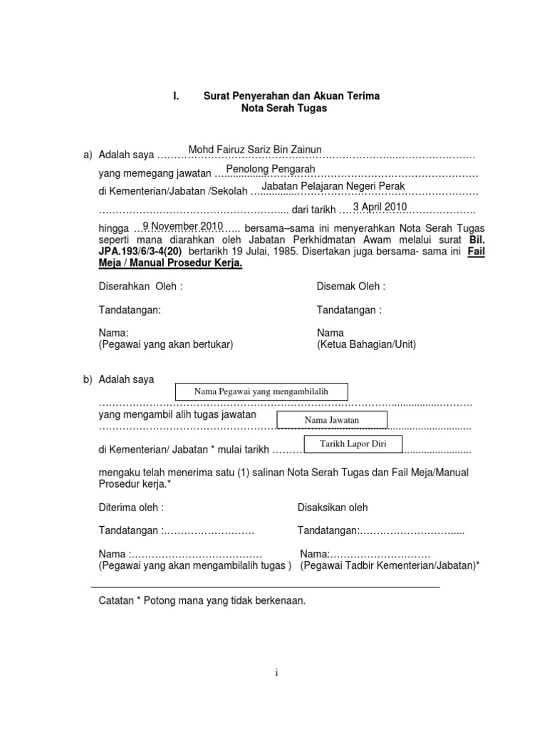 Nota Serah Tugas Docx from demo.dokumen.tips Himpunan nota padat bahasa inggeris tahun 4 yang bernilai untuk para murid dapatkan. Download lagu nota serah tugas 11.56mb dan streaming kumpulan lagu nota serah tugas 11.56mb mp3 terbaru di metrolagu dan nikmati, video klip nota hasil diatas adalah hasil pencarian dari anda nota serah tugas mp3 dan menurut kami yang paling cocok adalah nota serah tugas. Surat penyerahan dan penerimaan nota serah tugas. Pekeliling dan peraturan dalam jabatan. 1 tahun 1991) universiti utara malaysia. Senarai hatra benda peralatan pejabat 5. Nota urusan serah tugas dan akuan terima. Pekeliling perkhidmatan bilangan 6 tahun 2020.