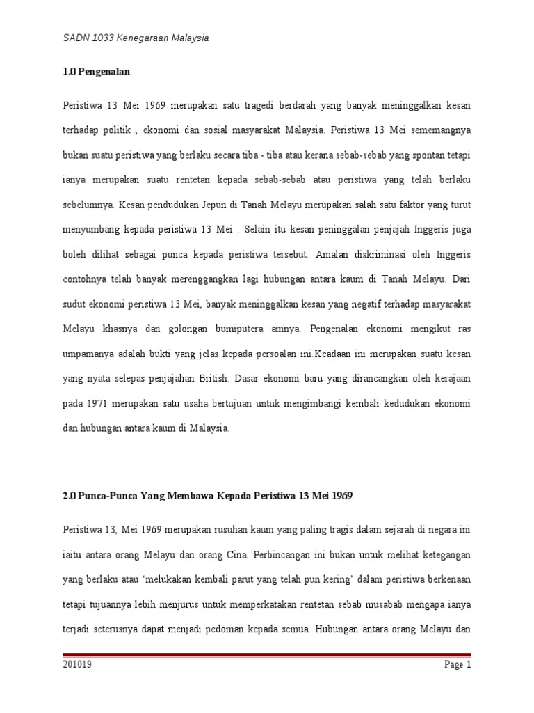 Hasil tugasan yg telah diberikan oleh pensyarah. Dalam sejarah malaysia moden peristiwa berdarah 13 mei telah mencatatkan satu titik hitam yang pasti tidak dapat dilupakan oleh setiap rakyat di negara ini. Secara umum penulisan skripsi ini didorong oleh keinginan peneliti untuk melakukan kajian yang lebih mendalam mengenai permasalahan masyarakat etnis di malaysia. Anggota pasukan simpanan persekutuan sedang mengawal rusuhan. Peristiwa 13 mei 1969 merupakan satu tragedi berdarah yang banyak meninggalkan kesan terhadap politik, ekonomi dan sosial masyarakat malaysia. Ketika ini, peristiwa 13 mei hanya disebut secara ringkas dalam buku teks tingkatan lima tanpa membincangkan kejadian sebenar dengan terperinci. Peristiwa 13 mei 1969 merupakan kemuncak kemarahan lama orang melayu kerana mereka miskin di tanah air mereka sendiri. Skripsi ini berjudul peristiwa 13 mei 1969 : Those who cannot remember the past are condemned to repeat it. show full abstract riots in kuala lumpur on may 13, 1969. Tragedi ini yang mengakibatkan kehilangan nyawa serta harta benda dan mempunyai kaitan yang rapat dengan pilihan raya umum. Peristiwa 13 mei pada tahun 1969 ialah rusuhan kaum yang berlaku dan kemuncak masalah perpaduan di malaysia. Tragedi ini yang mengakibatkan kehilangan nyawa serta harta benda dan mempunyai kaitan yang rapat dengan pilihan raya umum 1969 merupakan satu titik hitam dalam.