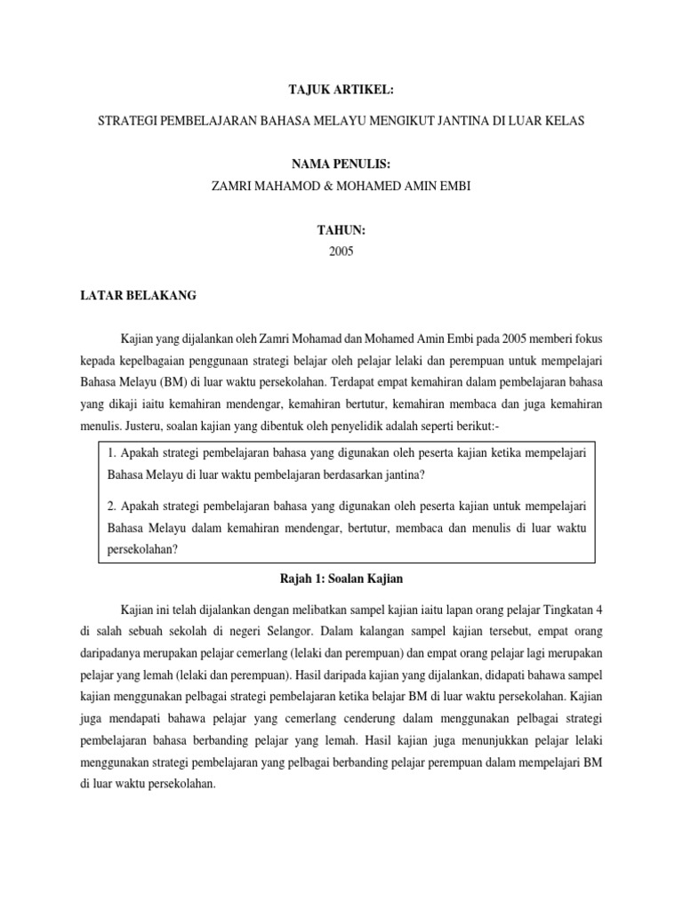 Contoh artikel ringkas contoh artikel bahasa melayu. Tunjukkan terjemahan yang dihasilkan secara algoritma. Ctu artikel review nah ac110 studocu. Kata nama ganti diri pertama kata nama khas in english kata nama dalam bahasa arab kata kata sindiran melayu pedas kata kata sindiran melayu kata nama khas haiwan tahun 1 kata kerja pasif tahun 4 kata mutiara imam al ghazali quotes. « newer post older post ». Literature review noun + tatabahasa a scholarly paper compiled from published sources, which sums up current knowledge of a particular topic. Writing a literature review a quick guide. Template resume dalam bahasa melayu terkini template cover letter for resume resume templates resume summary examples. Pdf teknik menulis review literatur dalam sebuah artikel ilmiah. Pelajar juga memastikan tiada fakta penting yang tertinggal. Artikel review memperkasakan bm 1. Dalam menulis proposal ataupun laporan hasil kerja dalam bentuk tugas akhir skripsi thesis ataupun dalam kegiatan kerja di perusahaan atau masyarakat studi pustaka ataupun literature review sangat diperlukan untuk memberikan dasar landasan yang kuat mengenai kenapa kita memilih tema tertentu kenapa kita menerapkan metode tertentu dan bukan. Literature review dalam bahasa melayu.